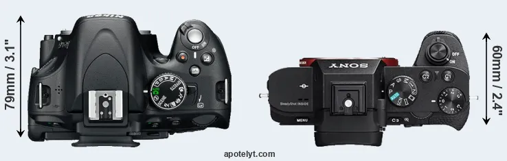 The physical size and weight of the Nikon D5100 and the Sony A7R II are illustrated in the side-by-side display below. The two cameras are presented according to their relative size. Three consecutive views from the front, the top, and the rear side are shown. All size dimensions are rounded to the nearest millimeter.