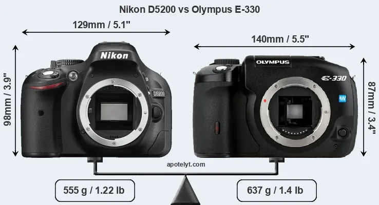 The physical size and weight of the Nikon D5200 and the Olympus E-330 are illustrated in the side-by-side display below. The two cameras are presented according to their relative size. Three successive views from the front, the top, and the rear are shown. All width, height and depth measures are rounded to the nearest millimeter.