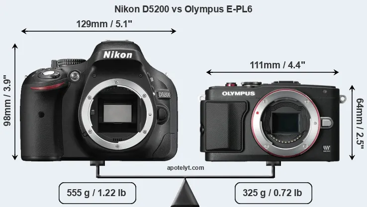 The physical size and weight of the Nikon D5200 and the Olympus E-PL6 are illustrated in the side-by-side display below. The two cameras are presented according to their relative size. Three consecutive perspectives from the front, the top, and the back are available. All width, height and depth dimensions are rounded to the nearest millimeter.
