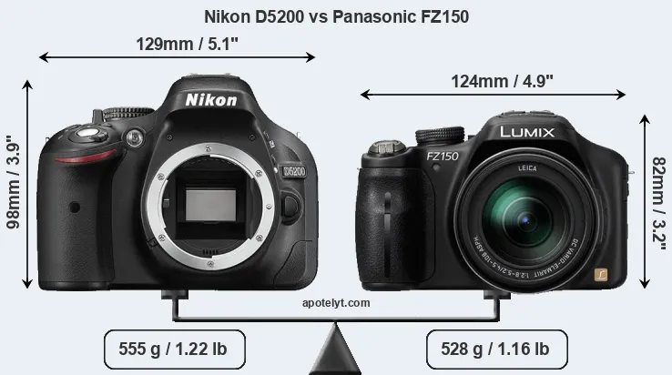 An illustration of the physical size and weight of the Nikon D5200 and the Panasonic FZ150 is provided in the side-by-side display below. The two cameras are presented according to their relative size. Three consecutive views from the front, the top, and the rear side are shown. All width, height and depth dimensions are rounded to the nearest millimeter.