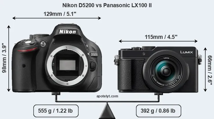 The side-by-side display below illustrates the physical size and weight of the Nikon D5200 and the Panasonic LX100 II. The two cameras are presented according to their relative size. Three successive views from the front, the top, and the rear are shown. All width, height and depth dimensions are rounded to the nearest millimeter.