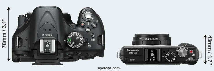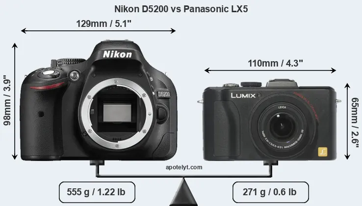 The side-by-side display below illustrates the physical size and weight of the Nikon D5200 and the Panasonic LX5. The two cameras are presented according to their relative size. Three consecutive perspectives from the front, the top, and the back are available. All size dimensions are rounded to the nearest millimeter.