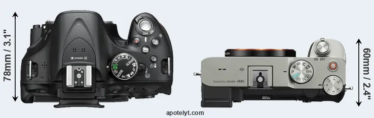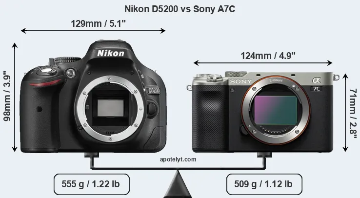 The side-by-side display below illustrates the physical size and weight of the Nikon D5200 and the Sony A7C. The two cameras are presented according to their relative size. Three successive views from the front, the top, and the rear are shown. All width, height and depth dimensions are rounded to the nearest millimeter.