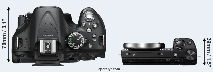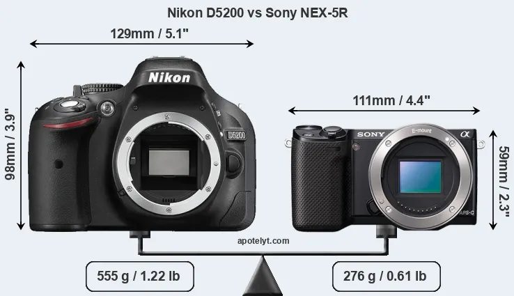 The physical size and weight of the Nikon D5200 and the Sony NEX-5R are illustrated in the side-by-side display below. The two cameras are presented according to their relative size. Three consecutive views from the front, the top, and the rear side are shown. All size dimensions are rounded to the nearest millimeter.