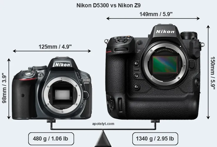 The side-by-side display below illustrates the physical size and weight of the Nikon D5300 and the Nikon Z9. The two cameras are presented according to their relative size. Three consecutive perspectives from the front, the top, and the back are available. All width, height and depth dimensions are rounded to the nearest millimeter.