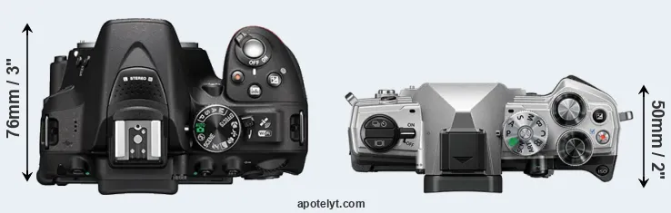 The side-by-side display below illustrates the physical size and weight of the Nikon D5300 and the OM System OM-5. The two cameras are presented according to their relative size. Three consecutive views from the front, the top, and the rear side are shown. All width, height and depth dimensions are rounded to the nearest millimeter.