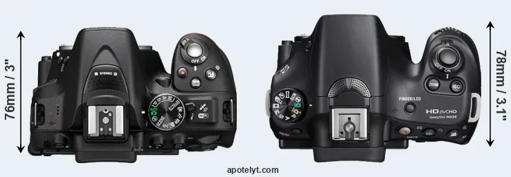The physical size and weight of the Nikon D5300 and the Sony A58 are illustrated in the side-by-side display below. The two cameras are presented according to their relative size. Three consecutive perspectives from the front, the top, and the back are available. All size dimensions are rounded to the nearest millimeter.