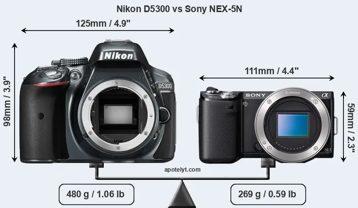 The side-by-side display below illustrates the physical size and weight of the Nikon D5300 and the Sony NEX-5N. The two cameras are presented according to their relative size. Three successive views from the front, the top, and the rear are shown. All width, height and depth measures are rounded to the nearest millimeter.