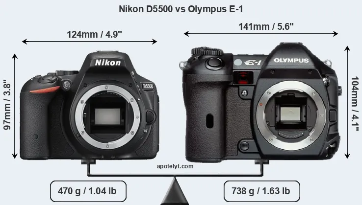 If the front view area (width x height) of the cameras is taken as an aggregate measure of their size, the Olympus E-1 is notably larger (22 percent) than the Nikon D5500. Moreover, the E-1 is substantially heavier (57 percent) than the D5500. It is noteworthy in this context that the E-1 is splash and dust-proof, while the D5500 does not feature any corresponding weather-sealing.