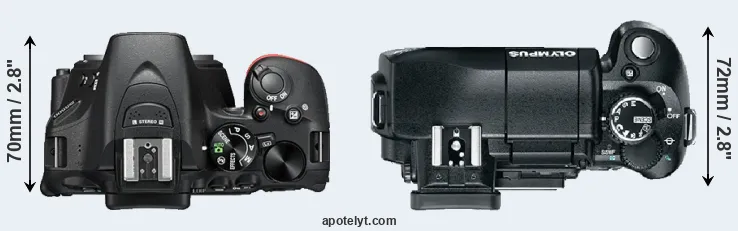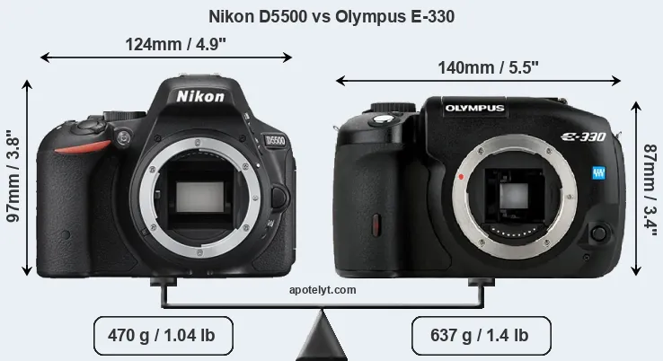 The side-by-side display below illustrates the physical size and weight of the Nikon D5500 and the Olympus E-330. The two cameras are presented according to their relative size. Three consecutive perspectives from the front, the top, and the back are available. All width, height and depth measures are rounded to the nearest millimeter.