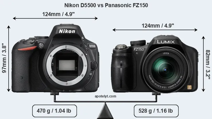 An illustration of the physical size and weight of the Nikon D5500 and the Panasonic FZ150 is provided in the side-by-side display below. The two cameras are presented according to their relative size. Three successive views from the front, the top, and the rear are shown. All width, height and depth measures are rounded to the nearest millimeter.