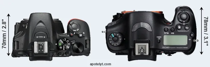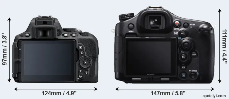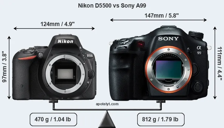 The side-by-side display below illustrates the physical size and weight of the Nikon D5500 and the Sony A99. The two cameras are presented according to their relative size. Three consecutive perspectives from the front, the top, and the back are available. All size dimensions are rounded to the nearest millimeter.