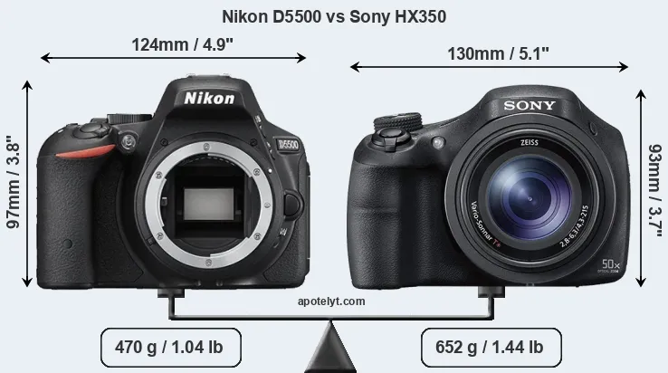 If the front view area (width x height) of the cameras is taken as an aggregate measure of their size, the Nikon D5500 and the Sony HX350 are of equal size. In this context, it is worth noting that neither the D5500 nor the HX350 are weather-sealed.