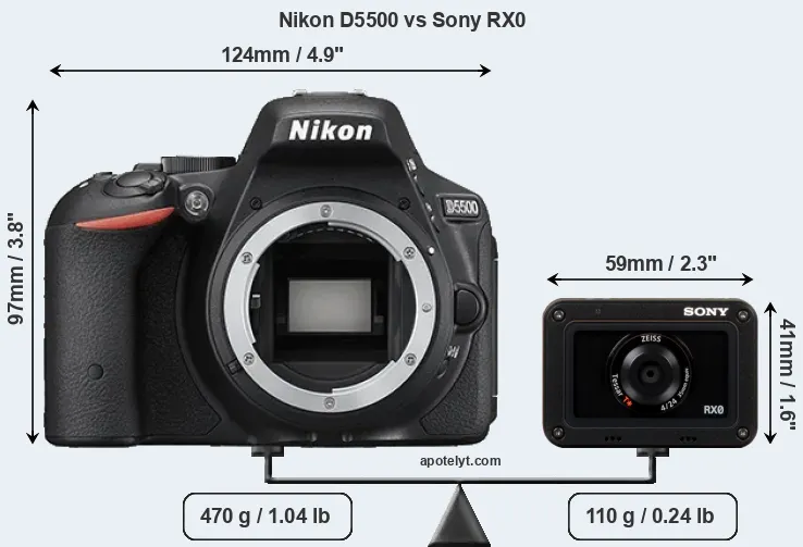 An illustration of the physical size and weight of the Nikon D5500 and the Sony RX0 is provided in the side-by-side display below. The two cameras are presented according to their relative size. Three consecutive views from the front, the top, and the rear side are shown. All width, height and depth measures are rounded to the nearest millimeter.