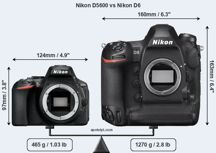 An illustration of the physical size and weight of the Nikon D5600 and the Nikon D6 is provided in the side-by-side display below. The two cameras are presented according to their relative size. Three consecutive views from the front, the top, and the rear side are shown. All width, height and depth measures are rounded to the nearest millimeter.