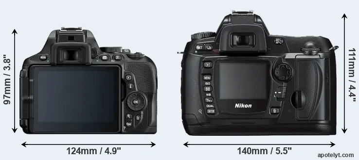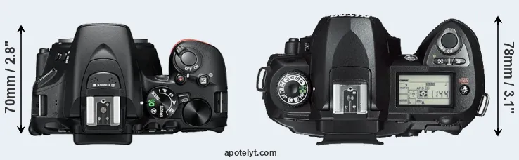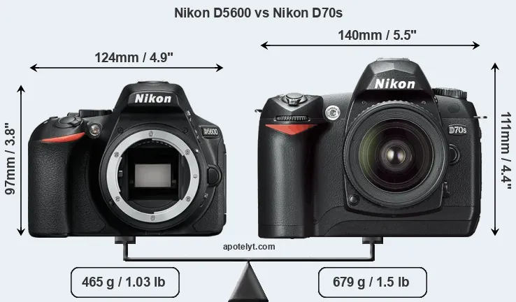 The side-by-side display below illustrates the physical size and weight of the Nikon D5600 and the Nikon D70s. The two cameras are presented according to their relative size. Three consecutive views from the front, the top, and the rear side are shown. All width, height and depth dimensions are rounded to the nearest millimeter.