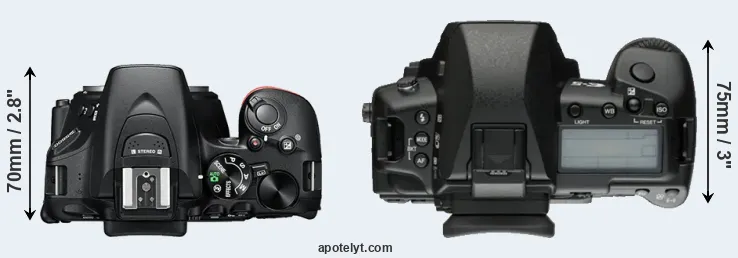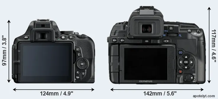 The side-by-side display below illustrates the physical size and weight of the Nikon D5600 and the Olympus E-5. The two cameras are presented according to their relative size. Three consecutive perspectives from the front, the top, and the back are available. All width, height and depth measures are rounded to the nearest millimeter.