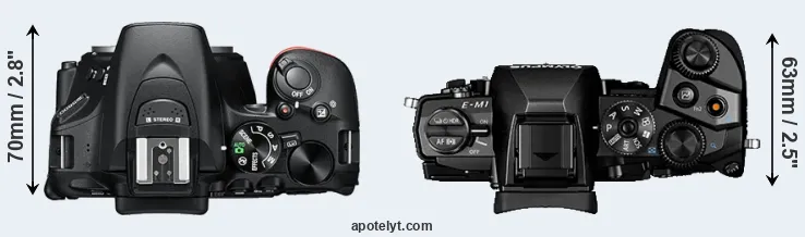 The physical size and weight of the Nikon D5600 and the Olympus E-M1 are illustrated in the side-by-side display below. The two cameras are presented according to their relative size. Three consecutive views from the front, the top, and the rear side are shown. All width, height and depth measures are rounded to the nearest millimeter.
