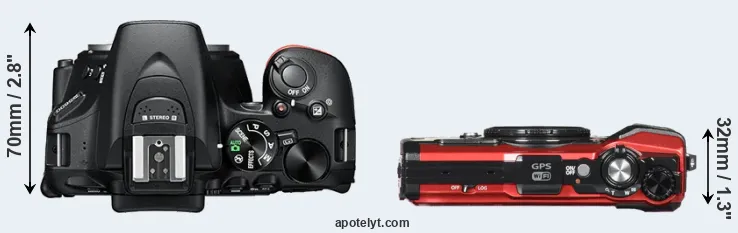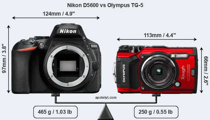 The physical size and weight of the Nikon D5600 and the Olympus TG-5 are illustrated in the side-by-side display below. The two cameras are presented according to their relative size. Three successive views from the front, the top, and the rear are shown. All width, height and depth measures are rounded to the nearest millimeter.