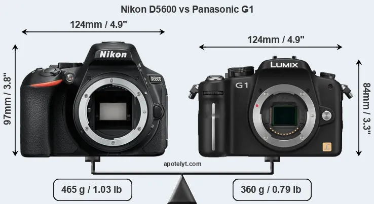 The side-by-side display below illustrates the physical size and weight of the Nikon D5600 and the Panasonic G1. The two cameras are presented according to their relative size. Three successive views from the front, the top, and the rear are shown. All width, height and depth measures are rounded to the nearest millimeter.