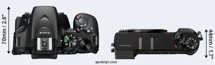 The physical size and weight of the Nikon D5600 and the Panasonic GX80 are illustrated in the side-by-side display below. The two cameras are presented according to their relative size. Three consecutive perspectives from the front, the top, and the back are available. All size dimensions are rounded to the nearest millimeter.