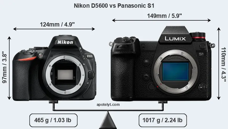 If the front view area (width x height) of the cameras is taken as an aggregate measure of their size, the Panasonic S1 is notably larger (36 percent) than the Nikon D5600. Moreover, the S1 is substantially heavier (119 percent) than the D5600. It is noteworthy in this context that the S1 is splash and dust-proof, while the D5600 does not feature any corresponding weather-sealing.