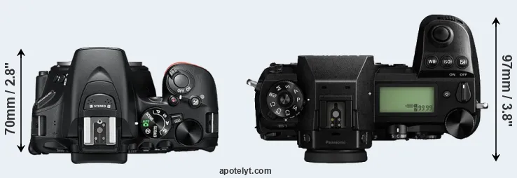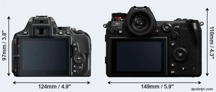 An illustration of the physical size and weight of the Nikon D5600 and the Panasonic S1 is provided in the side-by-side display below. The two cameras are presented according to their relative size. Three successive views from the front, the top, and the rear are shown. All size dimensions are rounded to the nearest millimeter.