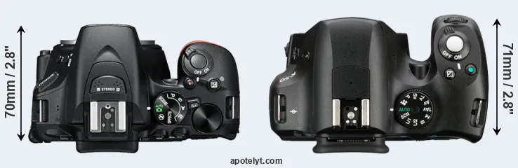 The side-by-side display below illustrates the physical size and weight of the Nikon D5600 and the Pentax K-50. The two cameras are presented according to their relative size. Three consecutive views from the front, the top, and the rear side are shown. All width, height and depth dimensions are rounded to the nearest millimeter.