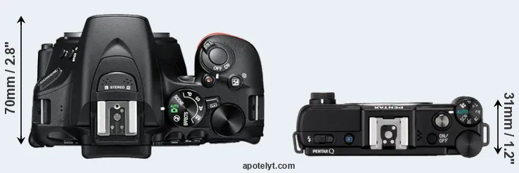 An illustration of the physical size and weight of the Nikon D5600 and the Pentax Q is provided in the side-by-side display below. The two cameras are presented according to their relative size. Three consecutive views from the front, the top, and the rear side are shown. All width, height and depth dimensions are rounded to the nearest millimeter.