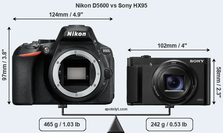 An illustration of the physical size and weight of the Nikon D5600 and the Sony HX95 is provided in the side-by-side display below. The two cameras are presented according to their relative size. Three consecutive perspectives from the front, the top, and the back are available. All size dimensions are rounded to the nearest millimeter.