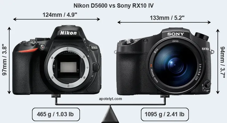 If the front view area (width x height) of the cameras is taken as an aggregate measure of their size, the Sony RX10 IV is somewhat larger (4 percent) than the Nikon D5600. It is noteworthy in this context that the RX10 IV is splash and dust-proof, while the D5600 does not feature any corresponding weather-sealing.