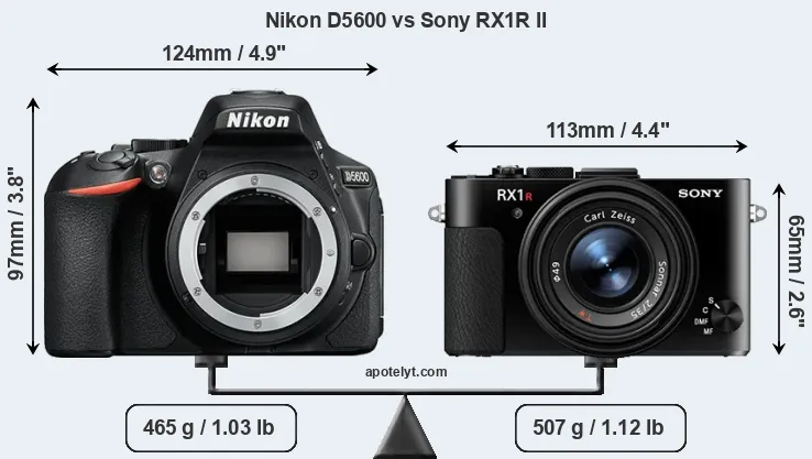The above size and weight comparisons are to some extent incomplete and possibly misleading, as the RX1R II has a lens built in, whereas the D5600 is an interchangeable lens camera that requires a separate lens. Attaching the latter will add extra weight and bulk to the setup. You can compare the optics available for the D5600 and their specifications in the Nikon Lens Catalog.