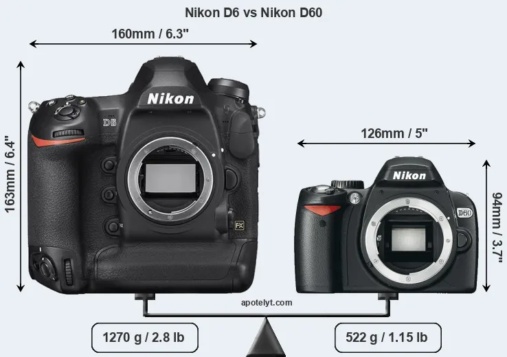 The above size and weight comparisons are to some extent incomplete since they do not consider the interchangeable lenses that both of these cameras require. A larger imaging sensor (as in the D6) will tend to go along with bigger and heavier lenses, while more compact options are available for the smaller-sensor camera (D60). You can compare the optics available in the Nikon Lens Catalog.