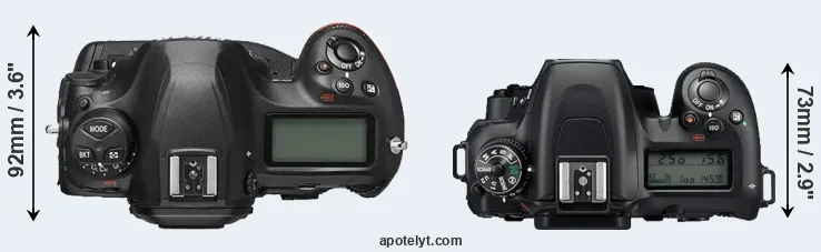 An illustration of the physical size and weight of the Nikon D6 and the Nikon D7500 is provided in the side-by-side display below. The two cameras are presented according to their relative size. Three consecutive views from the front, the top, and the rear side are shown. All width, height and depth measures are rounded to the nearest millimeter.