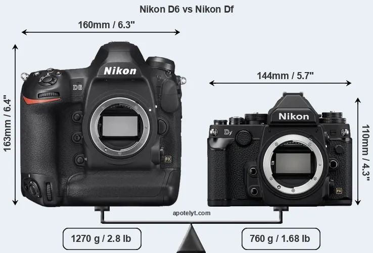 The physical size and weight of the Nikon D6 and the Nikon Df are illustrated in the side-by-side display below. The two cameras are presented according to their relative size. Three successive views from the front, the top, and the rear are shown. All size dimensions are rounded to the nearest millimeter.