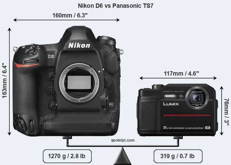 An illustration of the physical size and weight of the Nikon D6 and the Panasonic TS7 is provided in the side-by-side display below. The two cameras are presented according to their relative size. Three consecutive views from the front, the top, and the rear side are shown. All width, height and depth measures are rounded to the nearest millimeter.