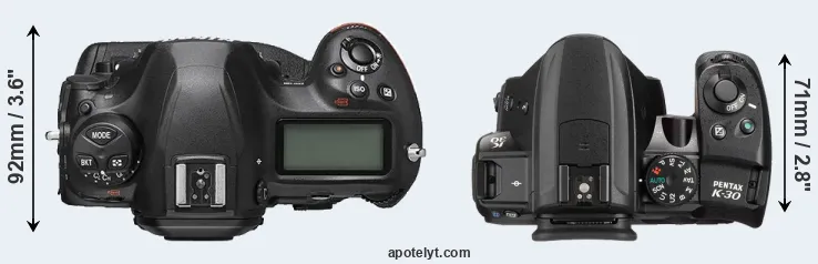 The side-by-side display below illustrates the physical size and weight of the Nikon D6 and the Pentax K-30. The two cameras are presented according to their relative size. Three consecutive views from the front, the top, and the rear side are shown. All width, height and depth dimensions are rounded to the nearest millimeter.