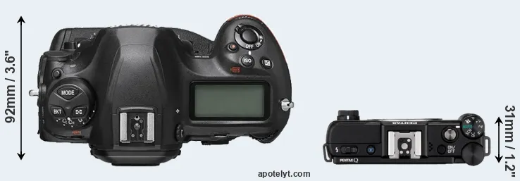 The physical size and weight of the Nikon D6 and the Pentax Q are illustrated in the side-by-side display below. The two cameras are presented according to their relative size. Three consecutive views from the front, the top, and the rear side are shown. All width, height and depth dimensions are rounded to the nearest millimeter.