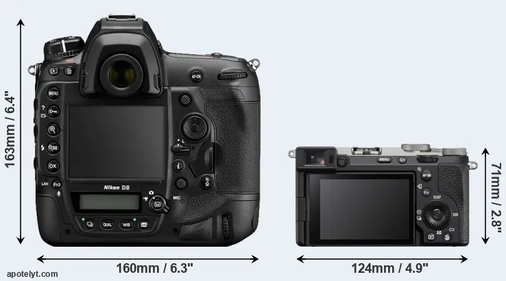 An illustration of the physical size and weight of the Nikon D6 and the Sony A7C R is provided in the side-by-side display below. The two cameras are presented according to their relative size. Three consecutive views from the front, the top, and the rear side are shown. All width, height and depth measures are rounded to the nearest millimeter.