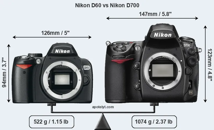 An illustration of the physical size and weight of the Nikon D60 and the Nikon D700 is provided in the side-by-side display below. The two cameras are presented according to their relative size. Three consecutive perspectives from the front, the top, and the back are available. All width, height and depth measures are rounded to the nearest millimeter.