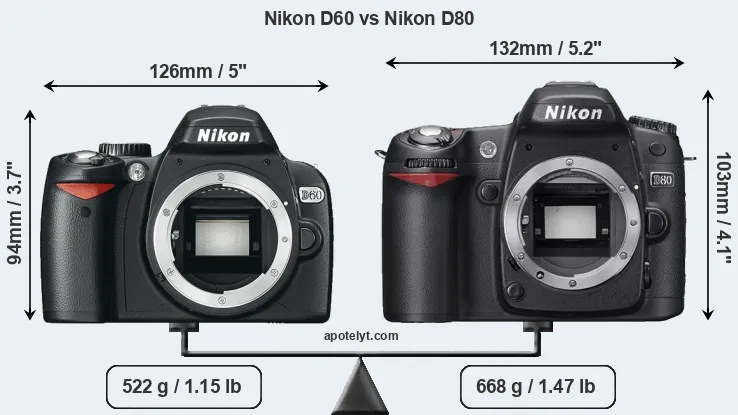 The side-by-side display below illustrates the physical size and weight of the Nikon D60 and the Nikon D80. The two cameras are presented according to their relative size. Three consecutive perspectives from the front, the top, and the back are available. All width, height and depth measures are rounded to the nearest millimeter.