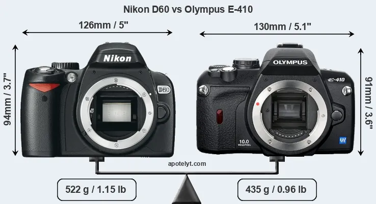 If the front view area (width x height) of the cameras is taken as an aggregate measure of their size, the Nikon D60 and the Olympus E-410 are of equal size. However, the E-410 is markedly lighter (17 percent) than the D60. In this context, it is worth noting that neither the D60 nor the E-410 are weather-sealed.