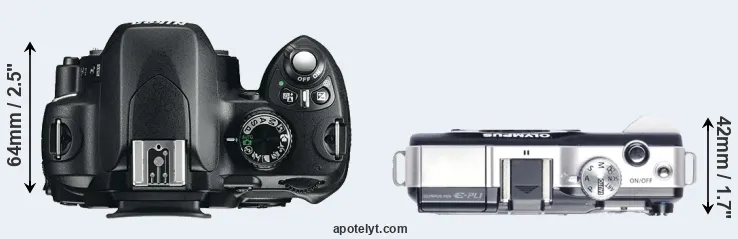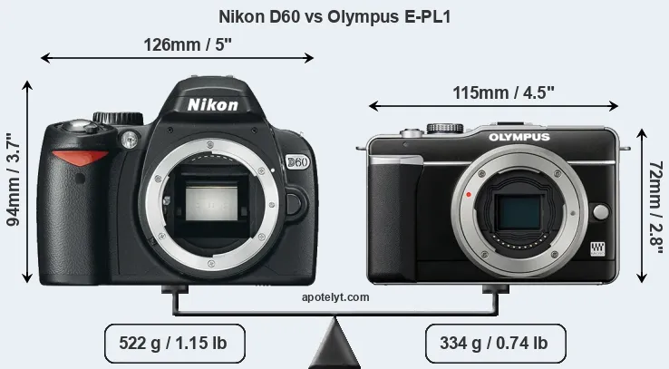 The side-by-side display below illustrates the physical size and weight of the Nikon D60 and the Olympus E-PL1. The two cameras are presented according to their relative size. Three successive views from the front, the top, and the rear are shown. All size dimensions are rounded to the nearest millimeter.