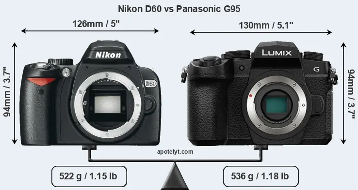 If the front view area (width x height) of the cameras is taken as an aggregate measure of their size, the Panasonic G95 is somewhat larger (3 percent) than the Nikon D60. Moreover, the G95 is slightly heavier (3 percent) than the D60. It is noteworthy in this context that the G95 is splash and dust-proof, while the D60 does not feature any corresponding weather-sealing.