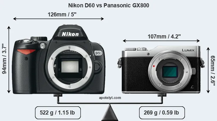 If the front view area (width x height) of the cameras is taken as an aggregate measure of their size, the Panasonic GX800 is considerably smaller (41 percent) than the Nikon D60. Moreover, the GX800 is substantially lighter (48 percent) than the D60. In this context, it is worth noting that neither the D60 nor the GX800 are weather-sealed.