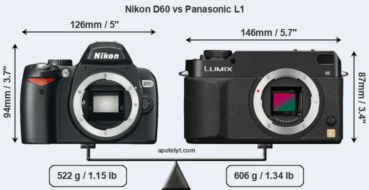 If the front view area (width x height) of the cameras is taken as an aggregate measure of their size, the Panasonic L1 is notably larger (7 percent) than the Nikon D60. Moreover, the L1 is markedly heavier (16 percent) than the D60. In this context, it is worth noting that neither the D60 nor the L1 are weather-sealed.