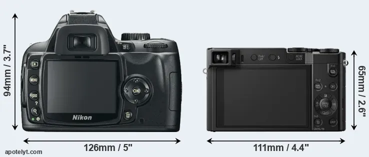 The physical size and weight of the Nikon D60 and the Panasonic TZ100 are illustrated in the side-by-side display below. The two cameras are presented according to their relative size. Three successive views from the front, the top, and the rear are shown. All width, height and depth dimensions are rounded to the nearest millimeter.