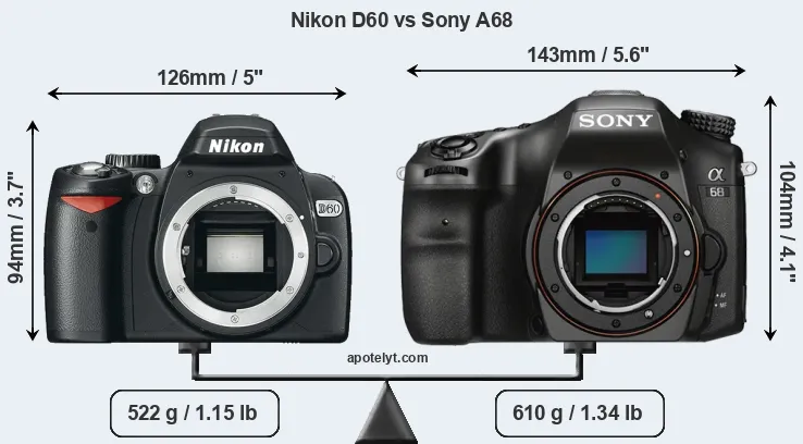 The physical size and weight of the Nikon D60 and the Sony A68 are illustrated in the side-by-side display below. The two cameras are presented according to their relative size. Three successive views from the front, the top, and the rear are shown. All size dimensions are rounded to the nearest millimeter.