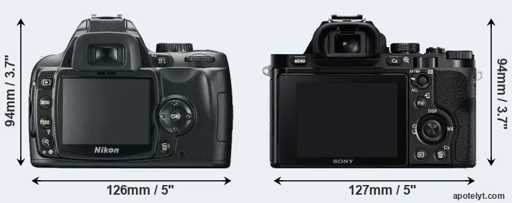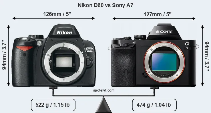 The side-by-side display below illustrates the physical size and weight of the Nikon D60 and the Sony A7. The two cameras are presented according to their relative size. Three successive views from the front, the top, and the rear are shown. All size dimensions are rounded to the nearest millimeter.