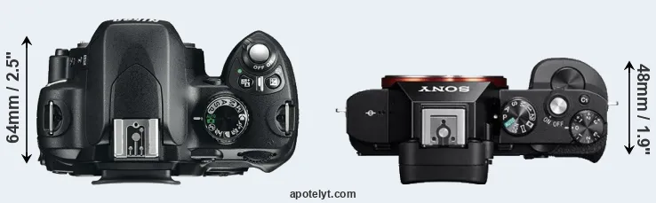 If the front view area (width x height) of the cameras is taken as an aggregate measure of their size, the Nikon D60 and the Sony A7 are of equal size. However, the A7 is markedly lighter (9 percent) than the D60. It is noteworthy in this context that the A7 is splash and dust-proof, while the D60 does not feature any corresponding weather-sealing.